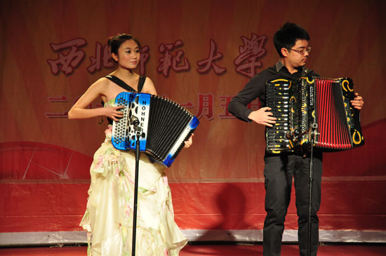 欢快的舞蹈跳起来,美妙的歌声响起来。我校舞蹈学院学生表演的舞蹈《兰花赋》、《少女像花儿一样》,音乐学院师生表演的女声独唱《祝福祖国》、唢呐独奏、手风琴二重奏、京胡独奏,男高音二重唱,兰州城市学院师生的女声独唱、竹笛独奏等精彩演出,把联谊会一次次推向高潮。我校舞蹈学院表演的舞蹈《鼓舞太平》,以其恢宏的气势和美好的祝福将联谊会推向了巅峰并拉下了帷幕。