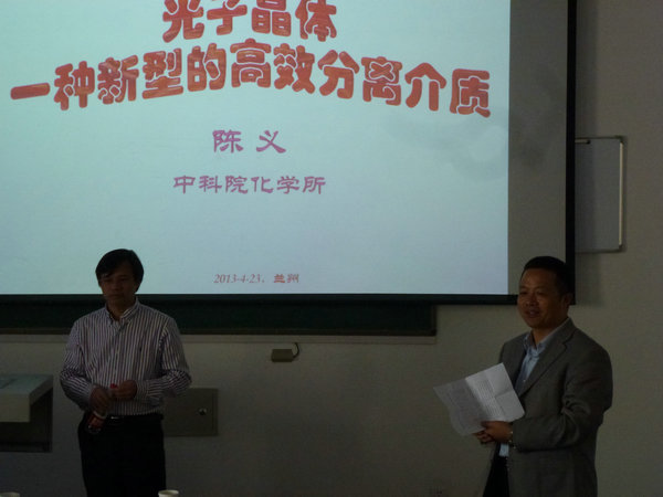 在报告中,陈义研究员从光子晶体的概念、特性、应用等方面切入,着重介绍了以二氧化硅为光子晶体材料,利用自组装或电沉积的方法使其在各种分析化学器件和毛细管内形成高度有序的面心立方堆积,尝试了在质谱和色谱等方面的应用,分别实现了对金簇的定性分析和对氨基酸、蛋白质等生物分子的分离测定。光子晶体作为高效分离介质的研究属于国际前沿领域。此报告使广大师生受益匪浅,同时陈义研究员诙谐幽默的语言赢得了阵阵掌声。