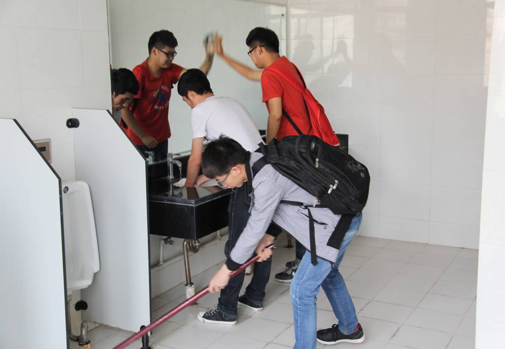 会后,学院组织毕业生进行了“我为母校添光彩”公共卫生间清扫活动。