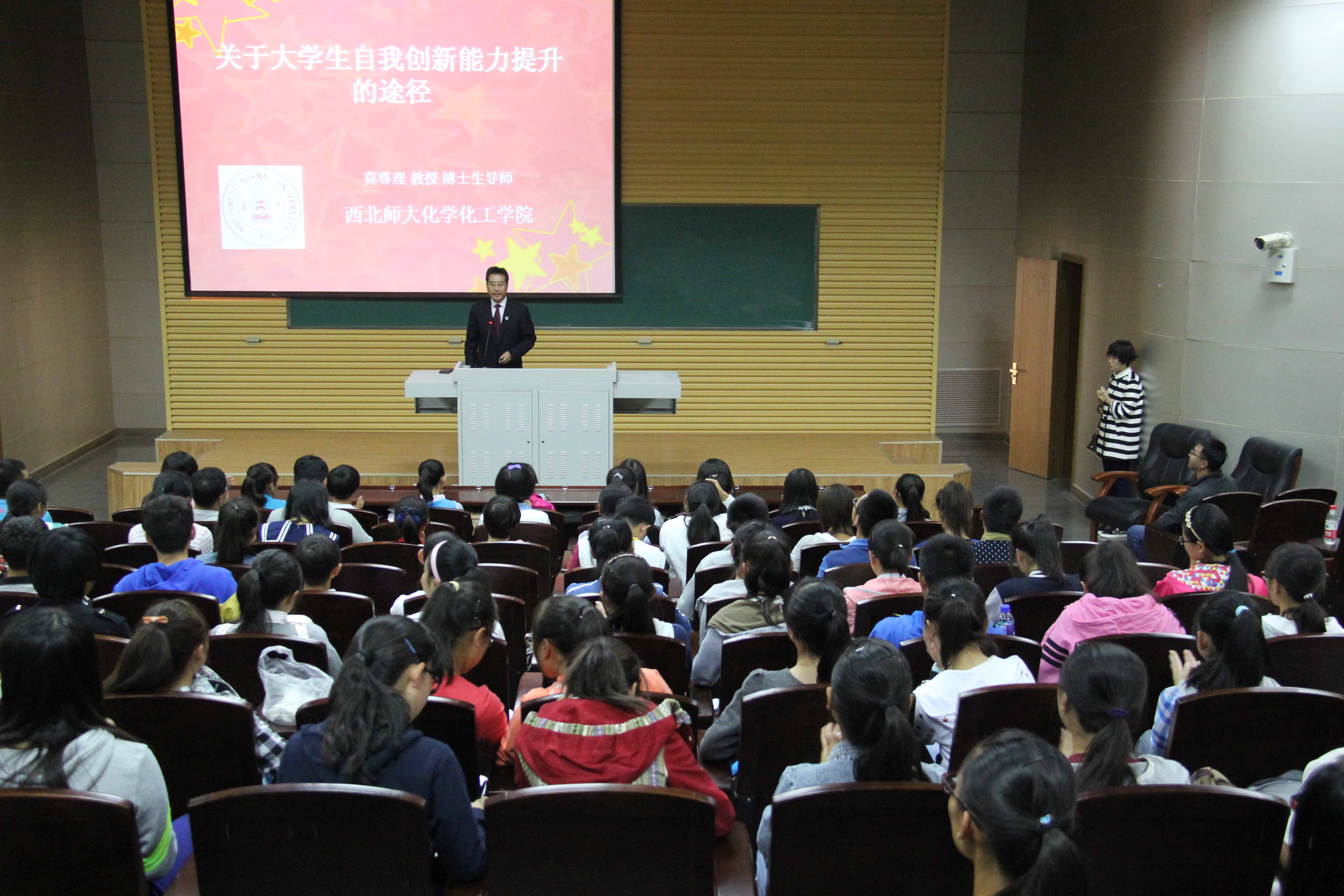2015年9月12日下午,化学化工学院党委书记赵卫东和博士生导师莫尊理老师在毅然报告厅为2015级新生做了两场报告会,全体新生约220人聆听了报告。