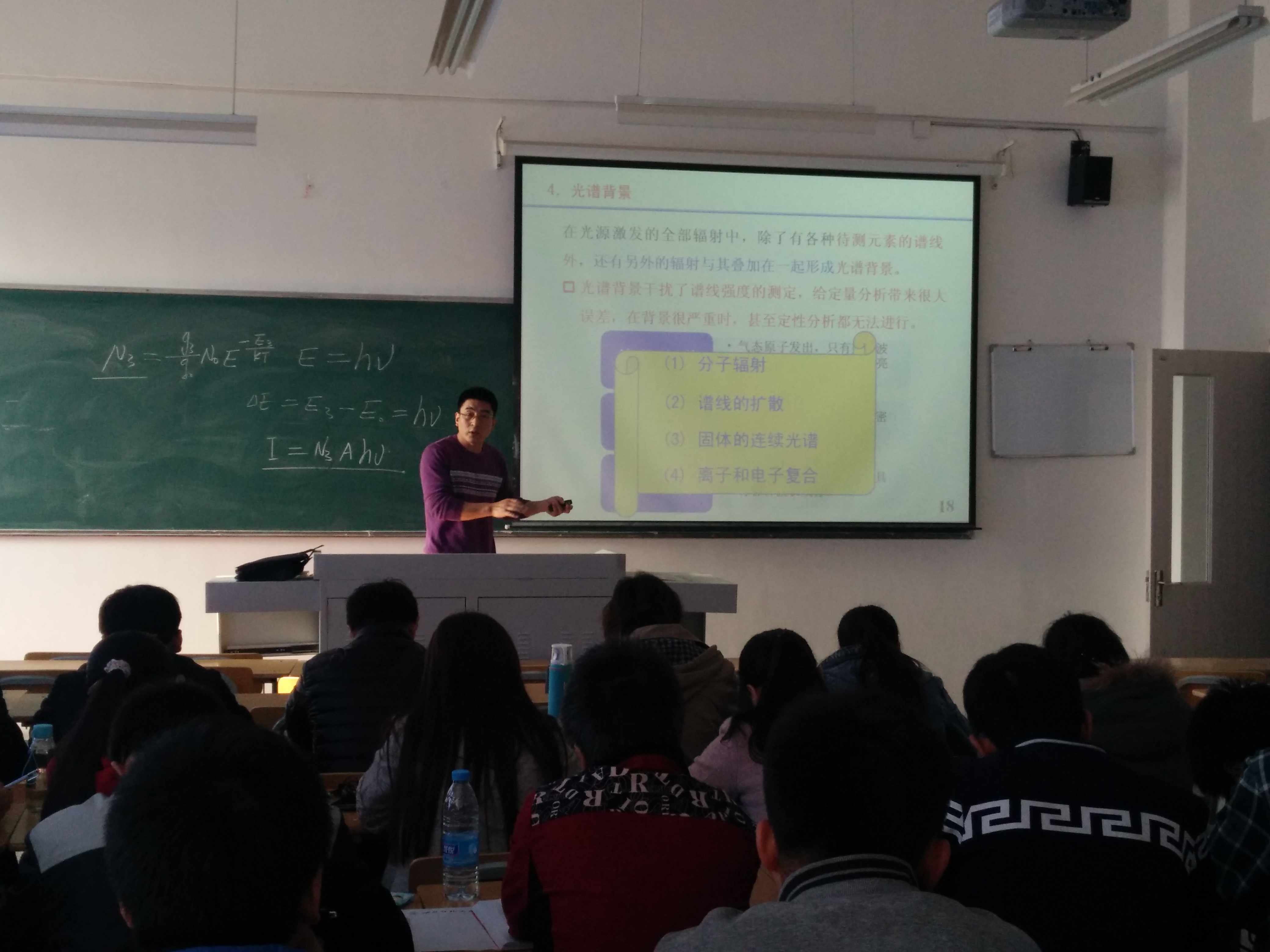 11月10日(星期二)5-6节课,在新校区108教室,高分子学科组的马国富老师进行了教学技能大赛公开课《材料现代分析方法》的讲授,杨志旺、马永钧等评委、高分子学科组老师及其他青年教师参加了听课和评课。