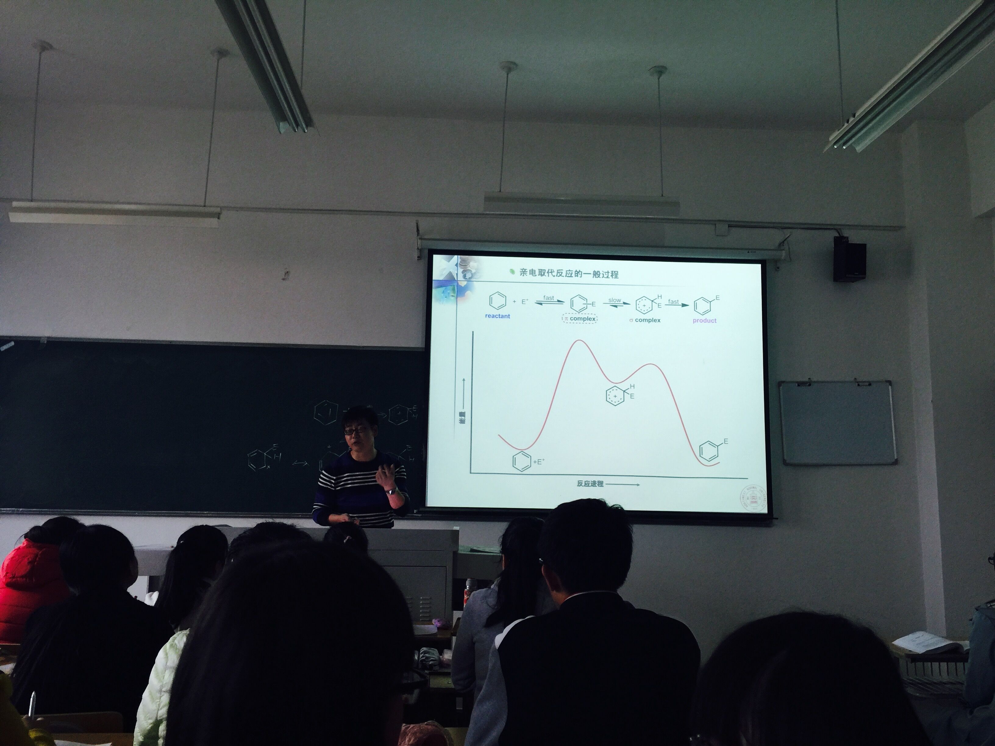 杨志旺老师从复习芳烃的硝化入手,顺畅的引入本节课的内容,分别重点讲述了芳香烃的卤化和磺化。通过亲电取代反应机理的讨论,着重强调了两个重要中间体sigma-络合物和π-络合物,并适当扩展了教材中的内容,介绍了药物分子中芳香卤代烃的广泛存在,拓展了学生的知识。杨老师对教材和所讲述的内容十分熟悉,教态自然大方,自始至终和学生保持着良好的互动,是一节成功的公开课,值得各位年轻教师观摩学习。马国富老师讲授原子发射光谱分析法,主要讲解了原子发射光谱法在材料定性及组分含量定量分析中的应用,重点讲解了光谱的发生,光谱强度的计算,电感耦合等离子光源的构造,发光原理及特点。两位老师都为本次公开课做了充分准备,清晰的讲解,良好的互动,受到了评委和学生的一致好评。讲课结束后,评委与听课教师对参赛教师的教学设计与课堂教学进行了分析与点评。