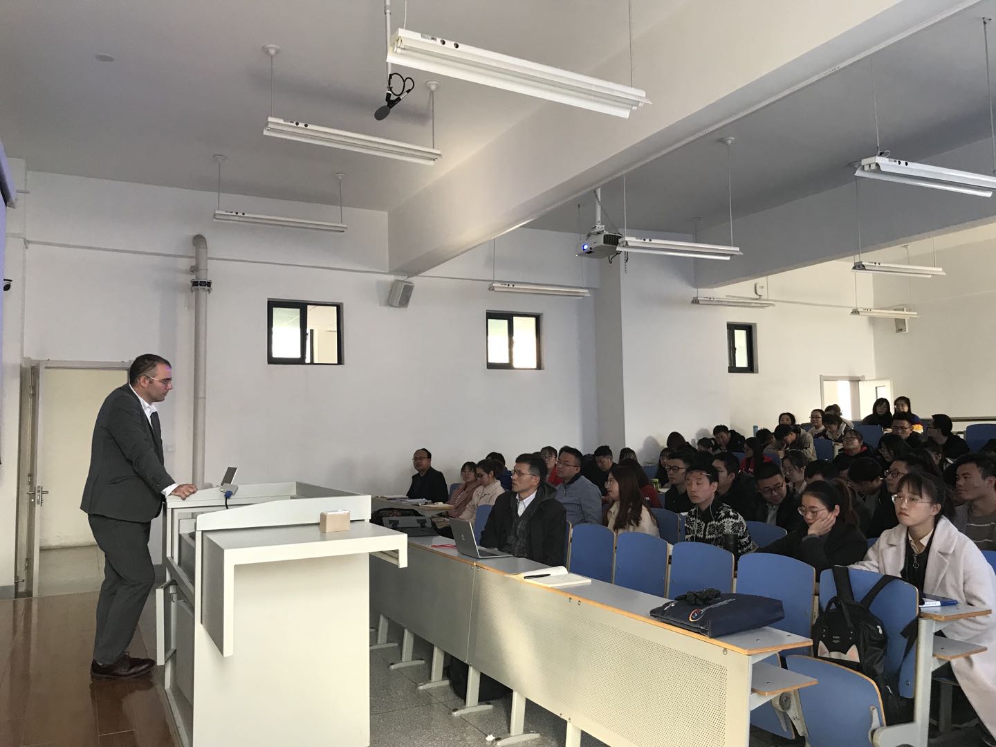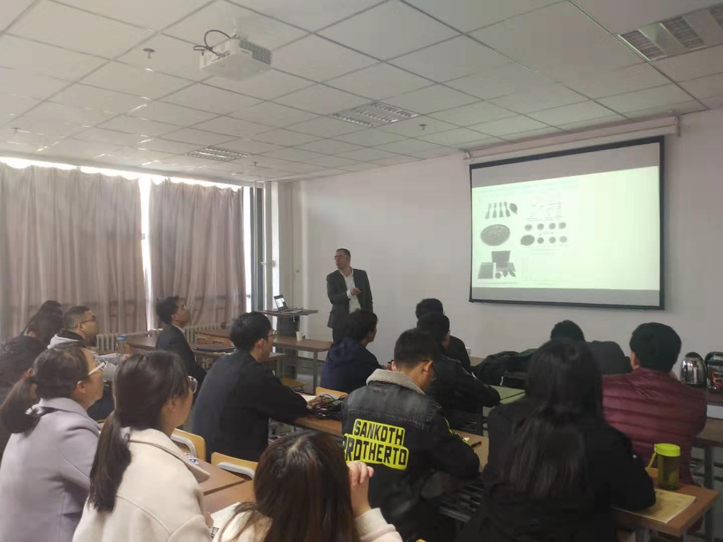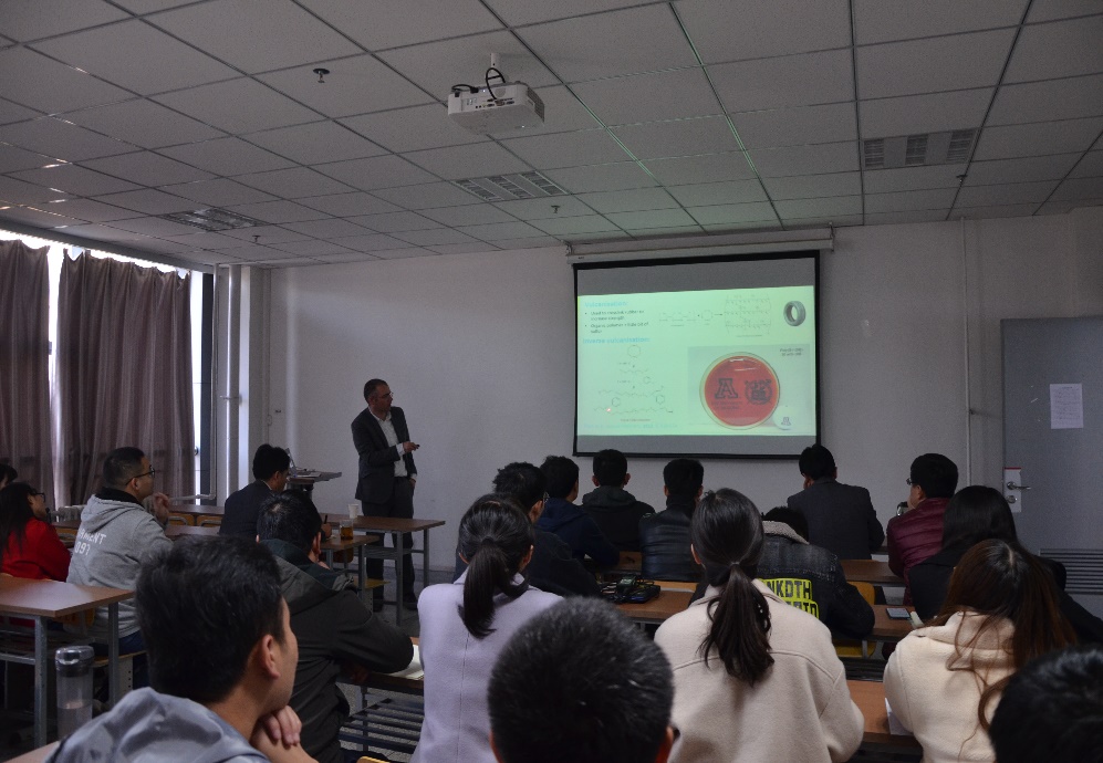 10月29日,上午,在新校区教学楼402教室,两位教授给80余名研究生讲授《有机合成化学》课程。两位教授分别对研究生讲授有机合成化学的前沿知识和科学研究方法、论文写作和投稿注意事项,并向介绍了英国利物浦大学化学系。下午,在综合实验楼E517教室,由Tom Hasell 教授进行了报告,题为《富硫聚合物》,化学化工学院教师,研究生积极参加了报告会。报告会由权正军教授主持。