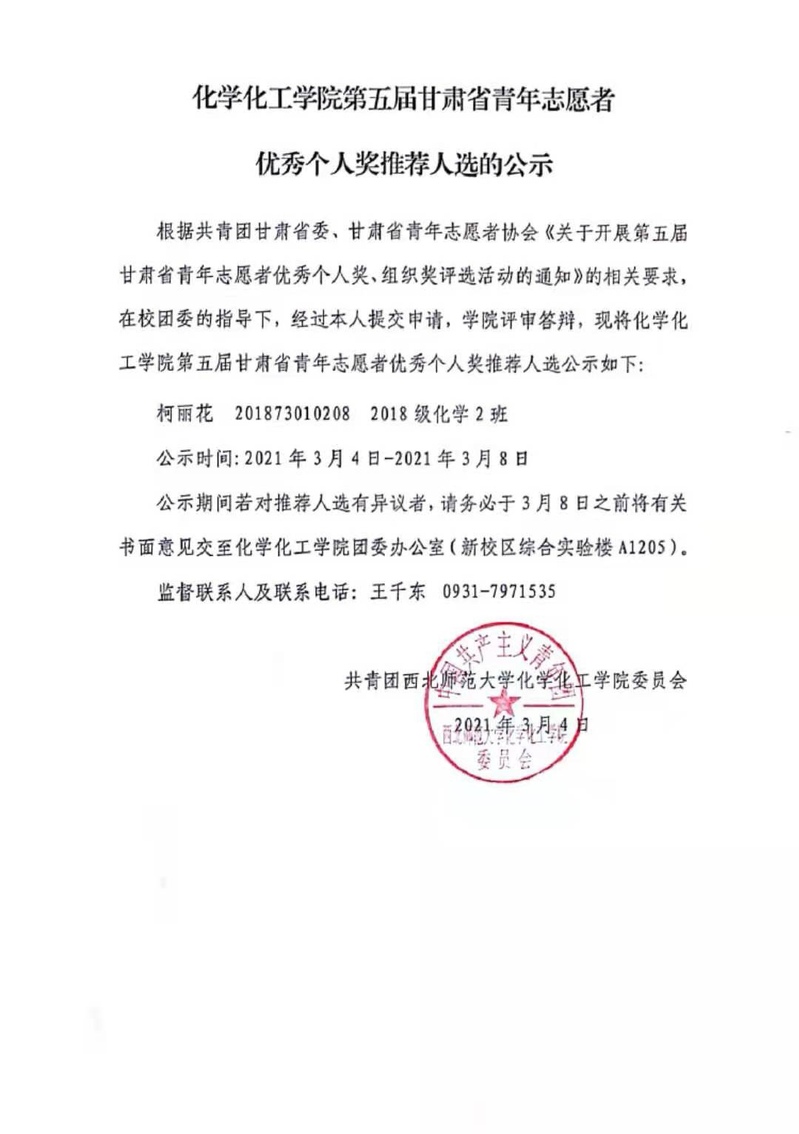 化学化工学院第五届甘肃省青年志愿者优秀个人奖推荐人选的公示