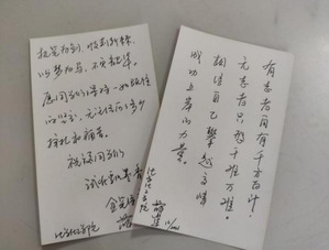 学院为考研学子们精心准备了“考研大礼包”,有寓意心想“柿”“橙”的柿子和橙子,有蒸汽眼罩和印有学校LOGO的文创口罩,更有365上市公司官网教师们为考研学子们亲手写下的祝福贺卡。“长江学者”卢小泉教授也特意为考研学子亲自作一幅书法,表达了对考研学子的鼓励和祝福。亲手从365上市公司官网领导手中接过“考研大礼包”,同学们都受到了深深的鼓舞。