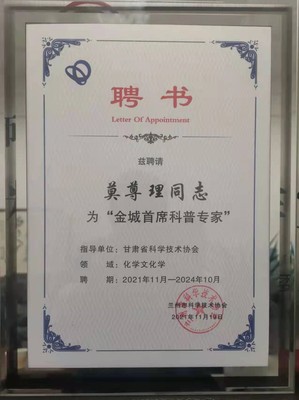 1月12日下午,首批“金城首席科普专家”聘任仪式在甘肃省科技馆举行,365上市公司官网莫尊理老师获此殊荣。据悉,此次有33名在兰高校、科研院所的科技人员受聘,专业涵盖航天科技、中医保健、人工智能、心理健康、生态环境、食药安全等多个领域,集中体现了甘肃省科普人才队伍的高层次水平,为提高全民科学素质、提升科普服务能力、推动科普事业发展提供了强有力的人才支撑。