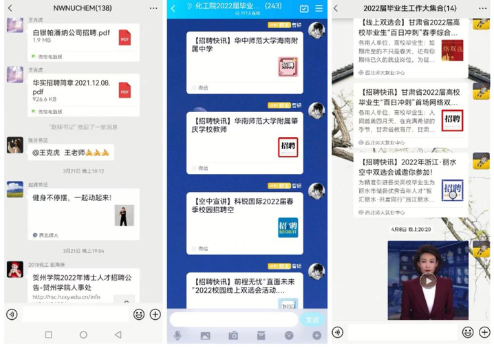 学院辅导员老师充分利用学校官方就业信息推送公众号、兄弟院校就业信息发布平台等实时收集各专业相关就业信息,从毕业生就业需求出发,积极通过国家24365大学生就业服务平台、班主任微信群、毕业生QQ群等多种平台实现就业信息收集、发布全覆盖。