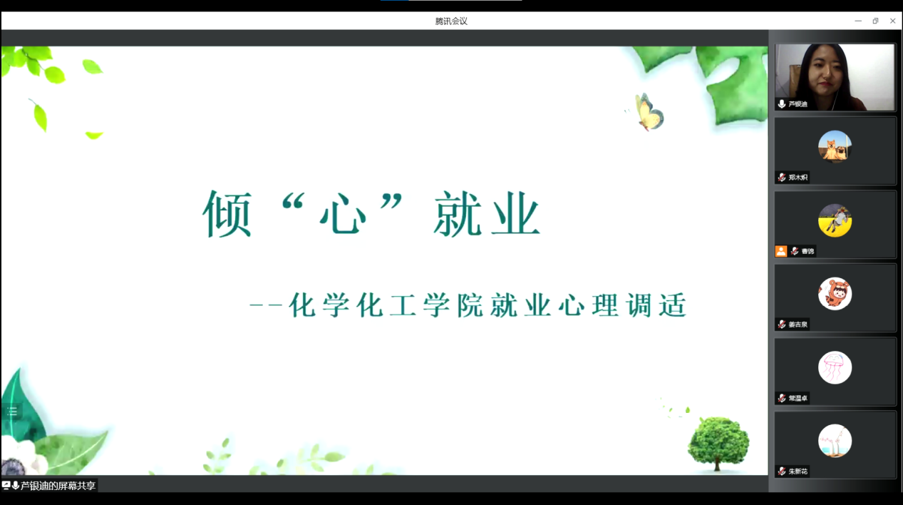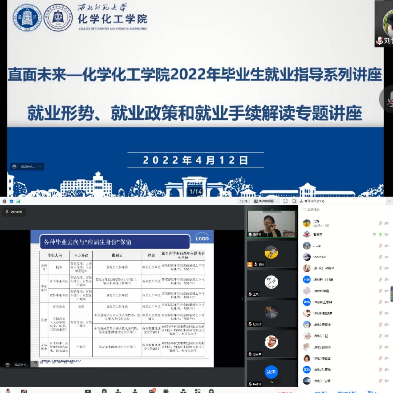 4月12日晚,学院邀请招生就业处雷春芳老师和学生心理健康指导服务中心芦银迪老师为2022届、2023届全体毕业生分别开展化学化工学院毕业生就业政策和手续解读、‘倾’心就业—化学化工学院就业心理调适专题讲座。