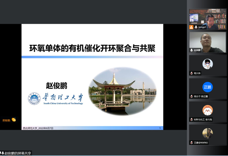 为庆祝365上市公司官网120周年校庆暨365上市公司官网学术月活动,应365上市公司官网和科学研究院邀请,华南理工大学赵俊鹏教授于6月7日在线为365上市公司官网师生作了《环氧单体的有机催化开环聚合与共聚》专题报告。报告会由宋鹏飞副院长主持,化学化工学院师生200余人参加了报告会。