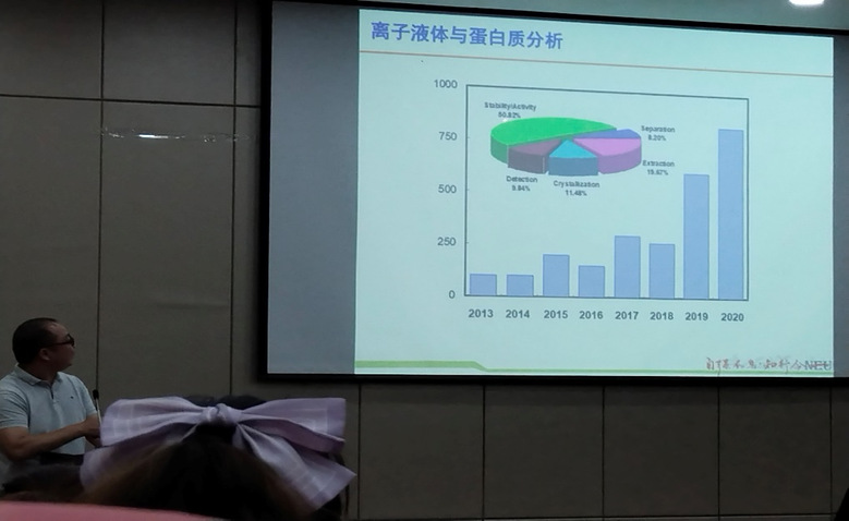 陈旭伟教授主要介绍了离子液体在蛋白质分离纯化应用方面的工作,系统说明了离子液体在蛋白质吸附过程的共性科学问题和关键技术研究。特别是团队通过交叉学科研究,利用化学知识解决了离子液体对蛋白质的吸附、回收等应用中存在的问题,构筑了基于离子液体的不同蛋白质分析检测传感体系。