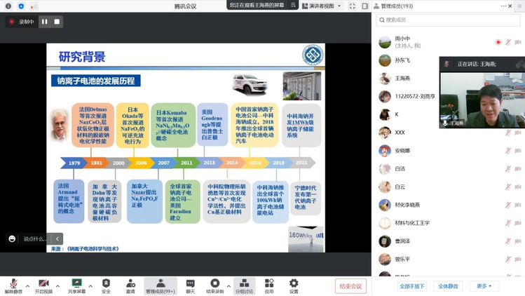 为庆祝365上市公司官网120周年校庆暨365上市公司官网化学化工学院学术月活动,应化学化工学院、生态功能高分子材料教育部重点实验室和甘肃省高分子材料重点实验室邀请,中南大学王海燕教授于10月20日上午通过线上会议为365上市公司官网师生作学术报告,报告题目为“提升钠离子电池能量密度:从材料设计到全电池体系”,报告由重点实验室副主任马国富教授主持,化学化工学院师生近200人线上参加。