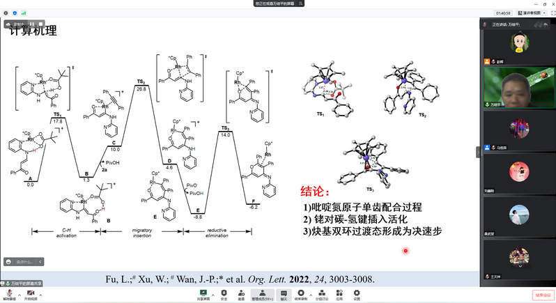 万结平教授首先概括介绍了烯胺酮化学的研究背景、研究团队在烯胺酮参与的有机反应如烯胺酮C=C键活化官能化、基于胺消除模式的芳环化反应、烯胺酮碳-氮键官能化反应、烯基碳-氢键活化官能化反应等方面的研究案例,以及烯胺酮参与的有机反应的应用探索工作。随后重点介绍课题组通过综合利用烯胺酮结构上不同的活性位点,设计和开发了多种用于结构多样性小分子化学物的新方法,特别是在内源性活化碳-氢键官能化、过渡金属催化碳-氢键活化串联环化等方面的研究成果进行了详细报告。
