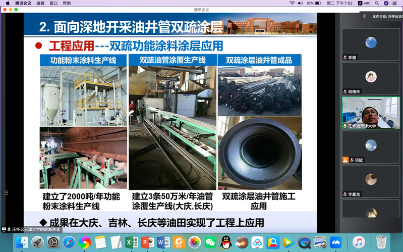 汪教授首先以碳达峰,碳中和国家战略为基准简要介绍了绿色低碳涂料与功能涂层技术的研究背景。然后,分别从阻垢防腐功能纳米涂层、面向深地开采油井管双疏涂层、CO2驱油装备防护功能涂层、高性能绿色水性涂料、发汗聚合物及其复合材料/涂层、微胶囊的合成与自修复涂层、高效导热防腐涂层及性能等七个方面重点介绍了团队的一些研究进展。最后总结开发长期防腐耐磨,减阻阻垢功能涂层,实现涂层/涂料防腐、阻垢、导热、耐磨、力学增强的环环相扣的创新成果,为实现20-100年寿命的防腐工程而努力。并展望了未来涂层/涂料的发展方向。