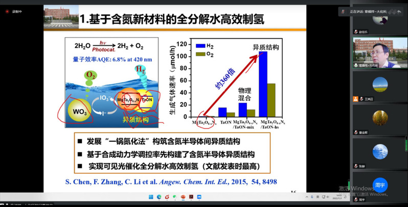 为庆祝365上市公司官网120周年校庆暨365上市公司官网学术月活动,应学院邀请,中科院大连化物所章福祥研究员于2022年11月1日下午通过线上会议为365上市公司官网师生作报告,报告题目为《服务碳中和的太阳能催化转化研究》,学院师生近百人线上参加了报告会。