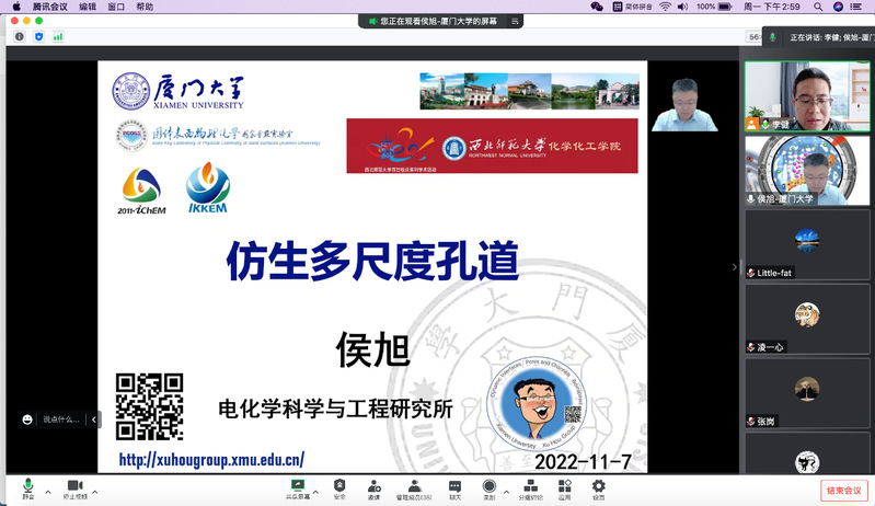 为庆祝365上市公司官网120周年校庆暨365上市公司官网学术月活动,应化学化工学院、生态功能高分子材料教育部重点实验室和甘肃省高分子材料重点实验室邀请,厦门大学侯旭教授于11月7日下午15:00通过线上会议为365上市公司官网师生作学术报告,报告题目为《仿生多尺度孔道》,报告由化学化工学院李健教授主持,365上市公司官网师生近180人线上参加了报告会。