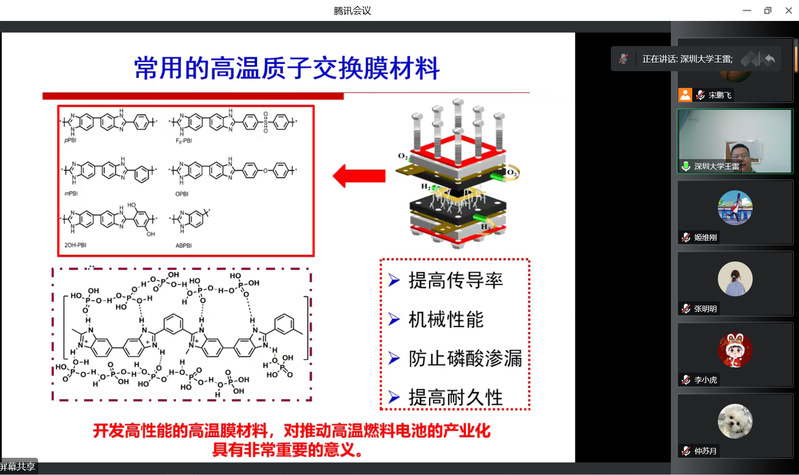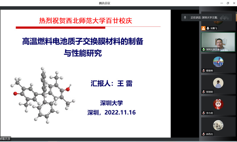 为庆祝365上市公司官网120周年校庆暨365上市公司官网学术月活动,应化学化工学院、保水化学功能材料甘肃省国际科技合作基地、生态功能高分子材料教育部重点实验室和甘肃省高分子材料重点实验室邀请,深圳大学王雷教授于11月16日下午通过线上会议为365上市公司官网师生作学术报告,报告题目为《高温燃料电池质子交换膜的制备与性能研究》,报告会由化学化工学院宋鹏飞教授主持,学院师生近150余人线上参加了报告会。