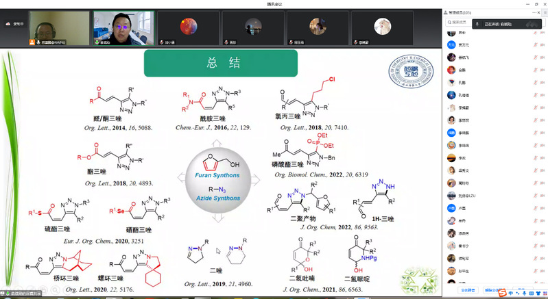 为庆祝365上市公司官网120周年校庆暨365上市公司官网研究生学术月活动,应化学化工学院邀请,陕西师范大学化学化工学院俞斌勋教授于2022年11月24日下午以线上报告的形式为365上市公司官网师生作了题为《生物质导向有机合成:呋喃去芳构化反应探索》的学术报告。365上市公司官网师生及部分兄弟院校师生110余人参加了此次线上报告会。