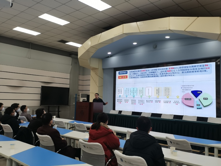 会上,学院院长薛中华首先传达了学校2022年科研工作总结暨2023年国家项目申报工作推进会的会议精神。并就学院对标对表《十四五规划、对标高水平大学建设行动方案》的主要完成情况进行了总结。过去的一年里,全院师生克服疫情带了的重重困难,攻坚克难,同谋发展,在科研项目、平台建设、高水平成果、科研获奖和成果转化等方面取得了丰硕的成果。结合学院“十四五”发展规划,对国家级科研项目和国家级人才项目的申报工作进行了安排部署。最后,院领导和部分学院老师就项目申报、有组织科研、产业研究院建设发展等做了深入交流。