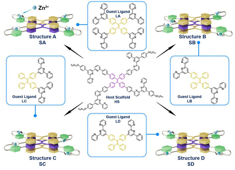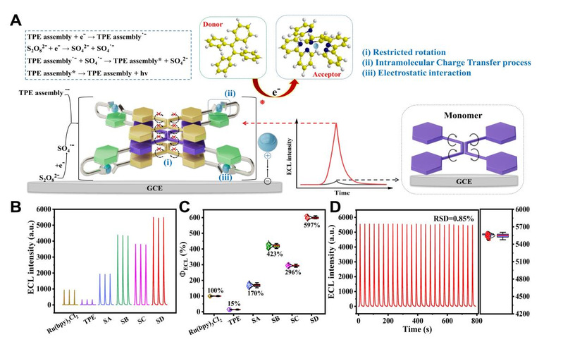 鉴于单分散四苯乙烯(tetraphenylethylene, TPE)单体的发光信号较低,该研究工作设计并合成了四种基于TPE基元的超分子结构,将其作为新型电化学发光(electrochemiluminescence, ECL)发射体,并在此提出了一种精准调控的分子内聚集诱导电化学发光(precisely modulated intramolecular aggregation–induced electrochemiluminescence, PI-AIECL)策略。不同于传统的ECL增强策略,该工作通过精准构建可控、有限的基元堆叠方式来调节苯环的自由旋转,进而实现在分子尺度上增强TPE的激发效率的目的。