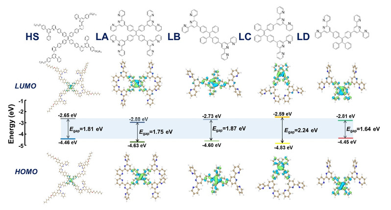 该研究工作中,作者合成了一系列具有精准堆积结构和可控基元数目的TPE超分子组装体,并通过电化学带隙和密度泛函理论(DFT)计算来深入探究其结构-性能关系。其中,SD组装体显示出最高的ECL阴极效率,其电化学发光效率超过TPE单体40余倍(水相)。为进一步解释发光体的结构-性质关系,一方面,作者进行了有机溶剂中的电化学测试,实验结果显示SD具有最低的电化学带隙;另一方面DFT计算表明,SD结构的客体配体(LD)的HOMO-LUMO带隙最小,与主配体(HS)的带隙更匹配,从而利于主客体间能量传递。