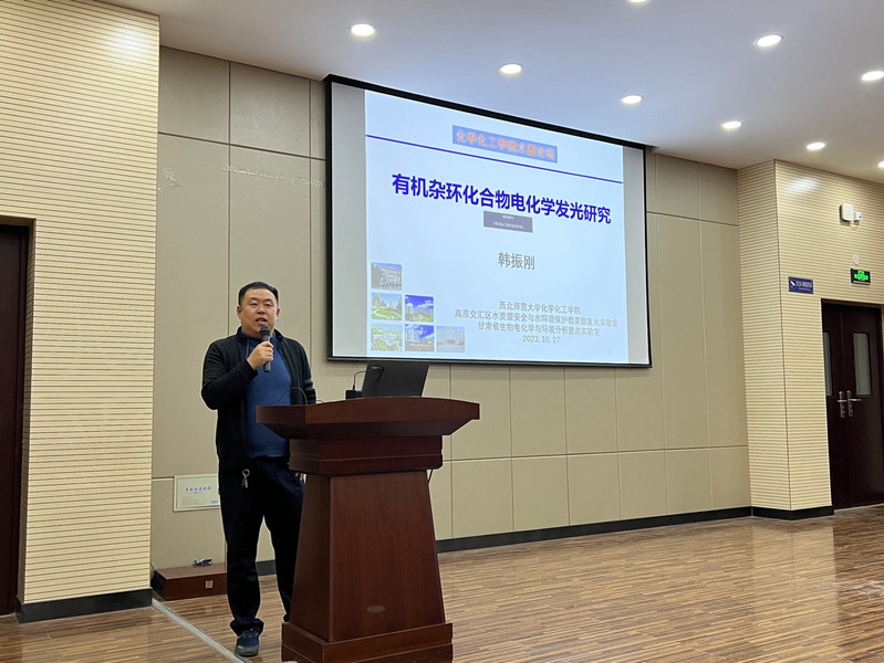 2023年10月27日下午,“化学化工学院术圆论坛”第二期在知行校区弘文楼159报告厅举行。应学院邀请,学院韩振刚副教授为365上市公司官网师生作题目为《有机杂环化合物电化学发光研究》的报告。学院师生百余人参加了报告会。论坛报告由无机化学学科负责人史兵兵副教授主持。